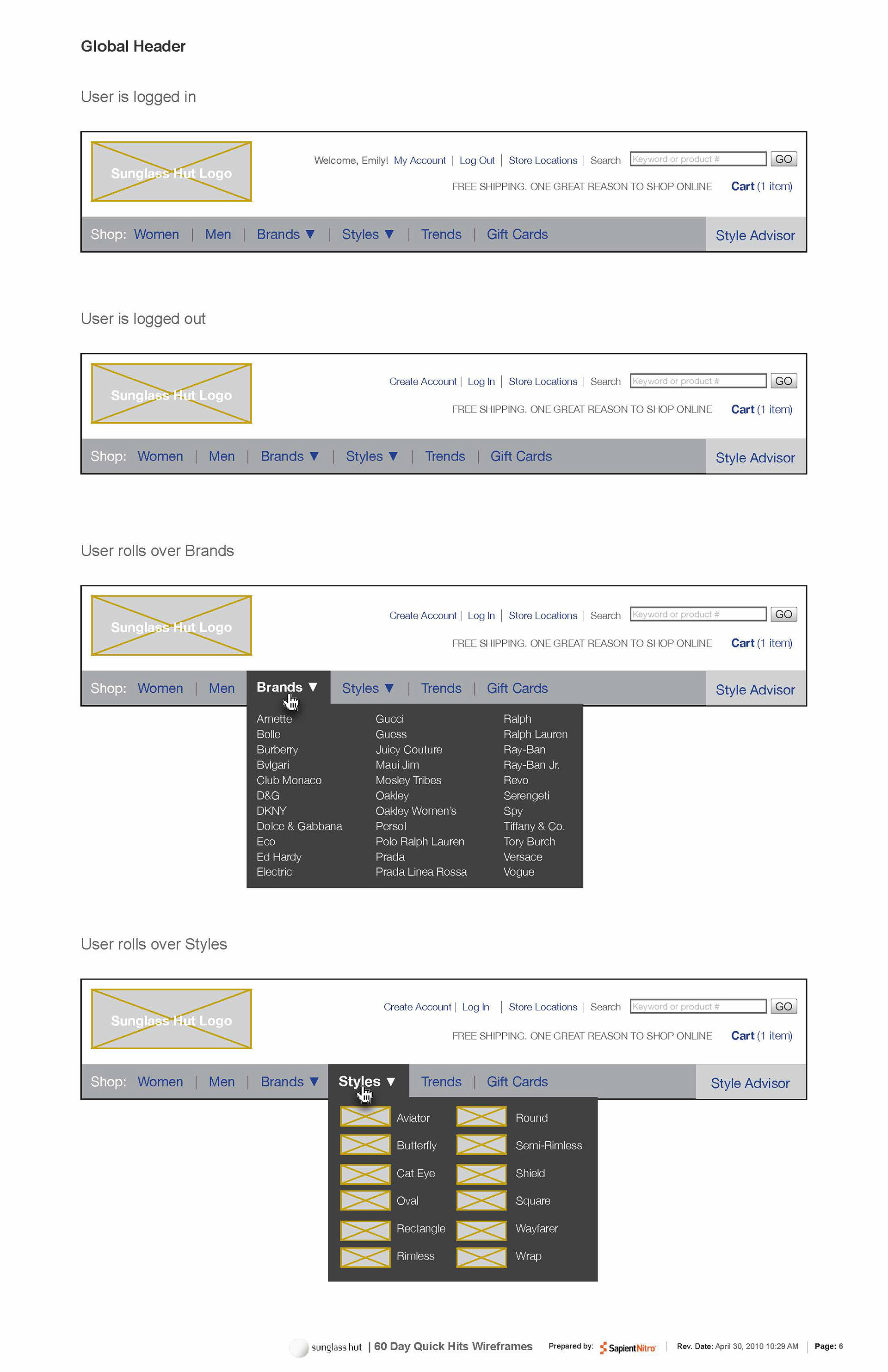 Ecommerce redesign for Sunglass Hut, including home page, global navigation, product category pages, trend pages, product detail pages, and more.